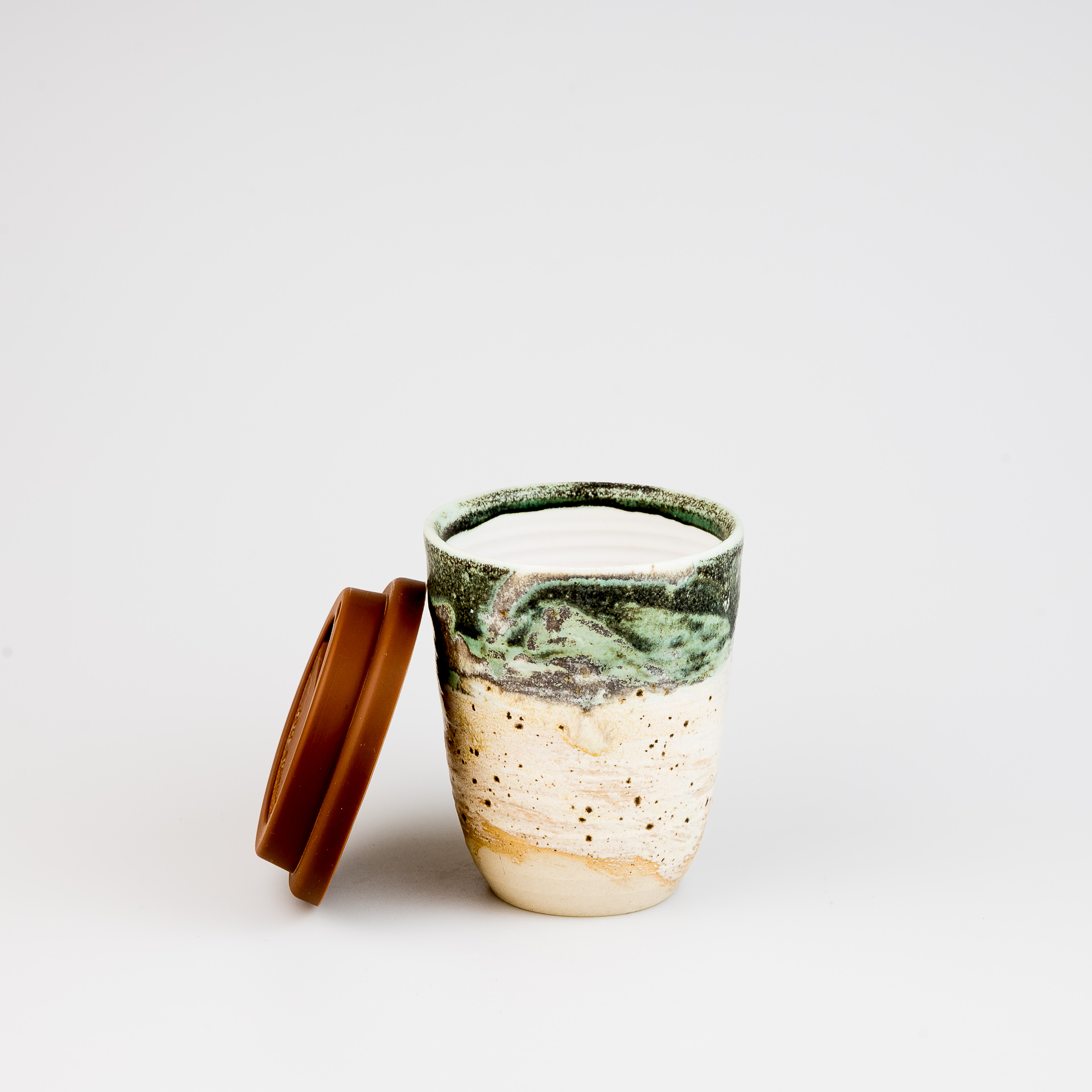 Zero waste – zabierz swój własny kubek do ulubionej kawiarni i chroń środowisko. Idź z nim na spacer lub umieść w uchwycie samochodowym. Silikonowa pokrywka z otworem do picia, idealnie pasuje do krawędzi kubka. Kubek toczony ręcznie na kole garncarskim, szkliwiony.